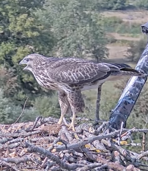 9K5, Clogwyn and Syfaddan have been absent from the nest increasingly. However, even though none are on the nest, the towpath Watchers record their whereabouts using visible perches across the valley. Viewing has also been accompanied by monotonous food soliciting calls from Clogwyn and 9K5 as they remain in the vicinity of the nest. Fish deliveries to the nest by the male Syfaddan normally prompt the immediate arrival of one of them. In what might be her last week at Gilestone there has been further evidence that Clogwyn is now catching larger fish for herself and returning to a perch nearby to consume. Fish delivery to the nest continues to be the prerogative of her male partner.