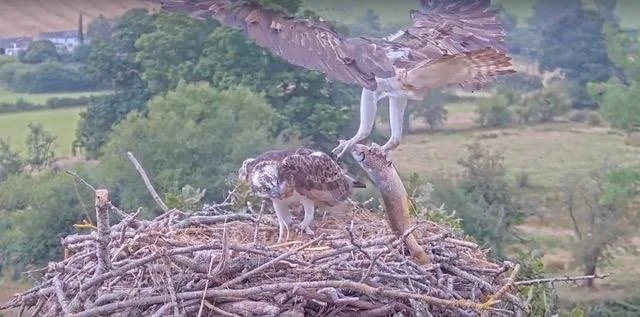 Data gathered by our Watchers this week (Wednesday - Saturday figures) shows that the female spent a total of 9 hrs 1 minute on the nest (average 2hrs/15 mins per day at 27 minutes per visit) and the male a more consistent total 2 hrs 23 minutes visiting the nest (average 36 mins per day at 5 minutes per visit) simply to deliver fish or nest materials. Peak nest occupation by the female of 3hrs 30 minutes occurred on Thursday 29th August. We know that at least FIVE ospreys were in the valley (Brecon to Llangynidr) on that afternoon suggesting that she sees these visitors as some threat to her nest and territory.