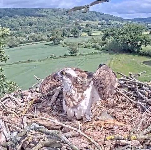 There were two occasions in the day when at least one intruding osprey threatened the nest and the safety of the chick. On the second of these, Syfaddan was absent and it was left to Clogwyn to make herself look as fierce as possible, unwilling to give chase and leave the chick unattended. She spread her wings wide and let out ear piercing disturbed calls, as the intruder flew over the nest twice and then came close a third time. But Clogwyn won the day and peace was restored. The chick had witnessed its first battle, while peeping out from under its mothers feathers.