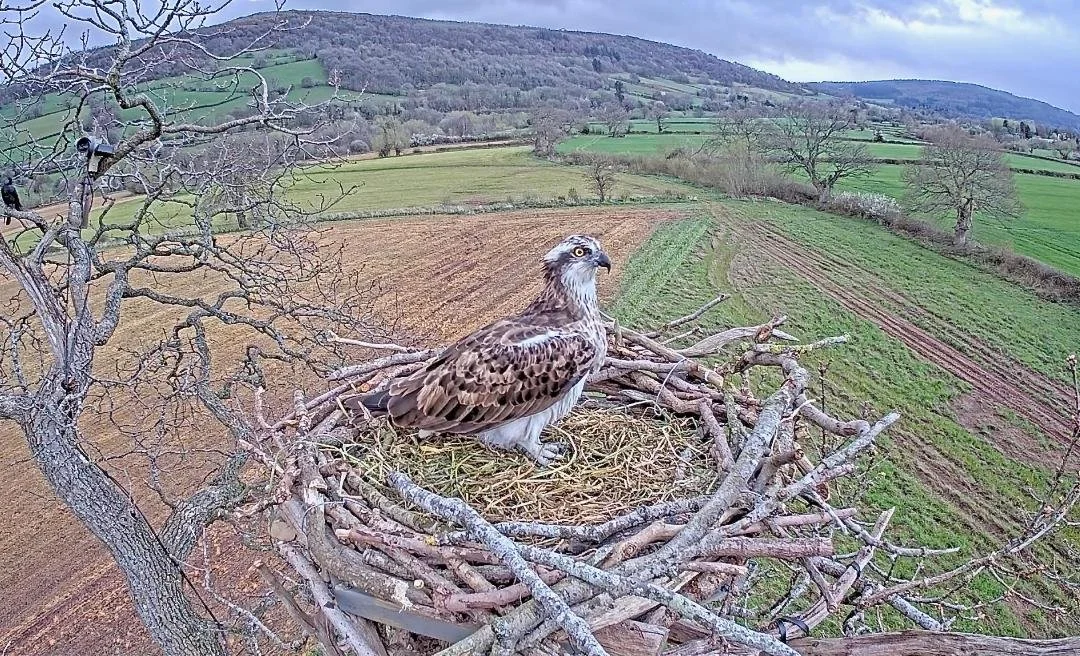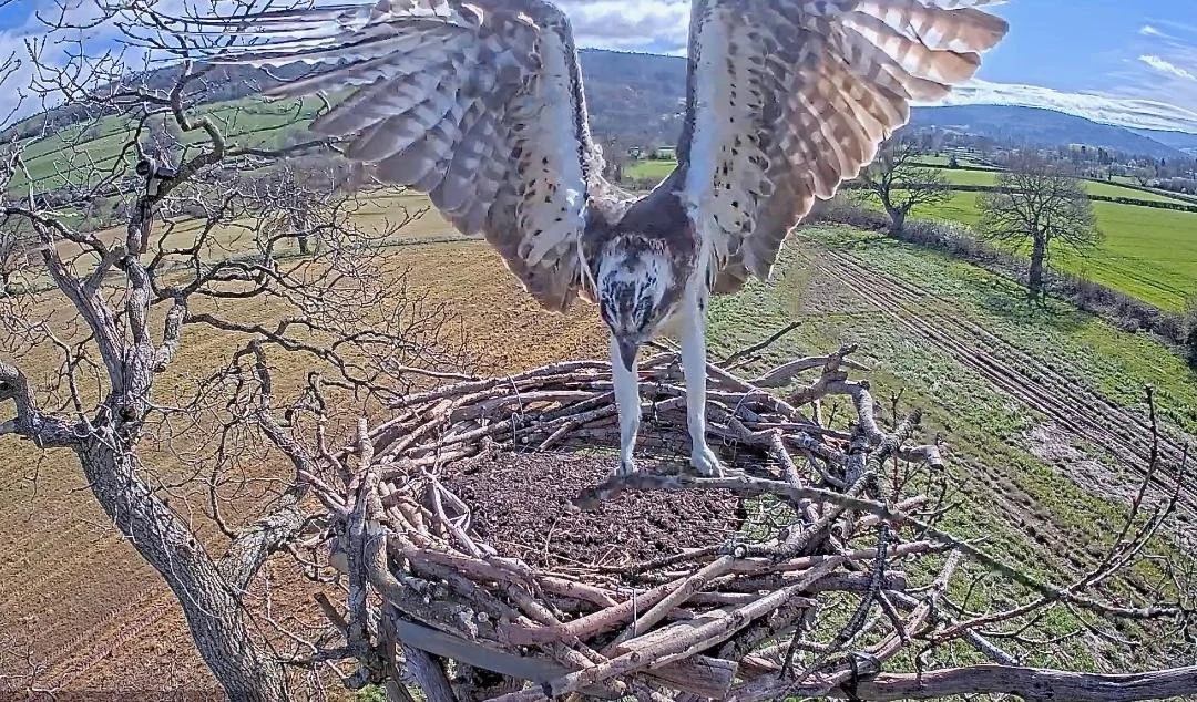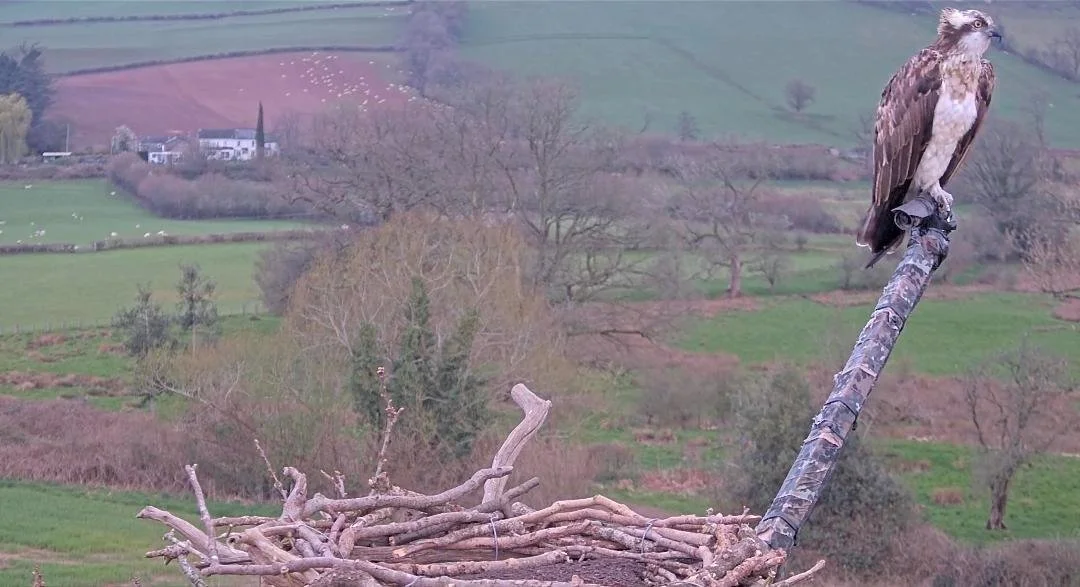 Tuesday morning, and Clogwyn made her usual early morning visit to the nest, perching on the cup camera to survey her territory. Eleven minutes later she was off again. But by mid morning it was as though a behavioural switch had been clicked. By now she was fully rested and well fed after her long migration, so with no male having arrived in advance, Clogwyn took it upon herself to make a start restoring the nest. Back and forth she went and several times attempted to rearrange the base sticks, not understanding that the reason why they just wouldn’t budge was because they were wired into place. Eventually there was nothing for it but to start bringing in new sticks and within the hour that followed, she brought in and arranged eight. Clogwyn paused only for moments as an inquisitive Red Kite, visible on both cameras, circled the nest and then seemingly lost interest and drifted away.